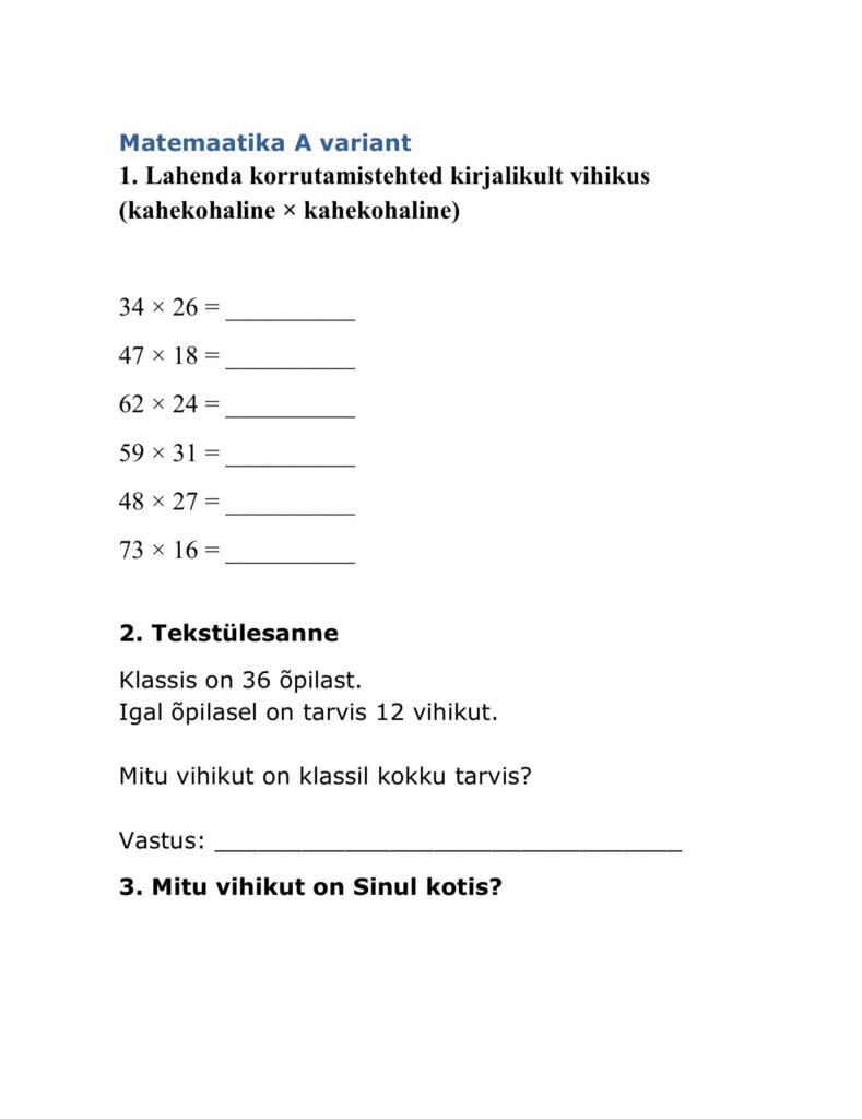 Eestis on õpetamise ja hindamise toetamiseks välja töötatud mitmekesised ning kvaliteetsed õppematerjalid. Saadaval on nii riiklikult arendatud e-testid – Üldpädevustestid | Haridus- ja Noorteamet töölehed kui ka digitaalsed keskkonnad, mis võimaldavad õpilaste teadmisi ja oskusi süstemaatiliselt kaardistada. Materjalid on üles ehitatud õppekava põhiselt ning arvestavad erinevate vanuseastmete ja õppijate tasemetega. Erilist tähelepanu on pööratud diagnostilistele ülesannetele, mis toetavad õpetaja professionaalset otsustamist ja individuaalse lähenemise kujundamist. Digilahenduste kasutamine võimaldab tulemusi kiiresti analüüsida ning õpet vastavalt vajadusele kohandada. Selline terviklik lähenemine loob õpetajale tugeva aluse tõenduspõhise ja õppijat toetava õppetöö kavandamiseks.