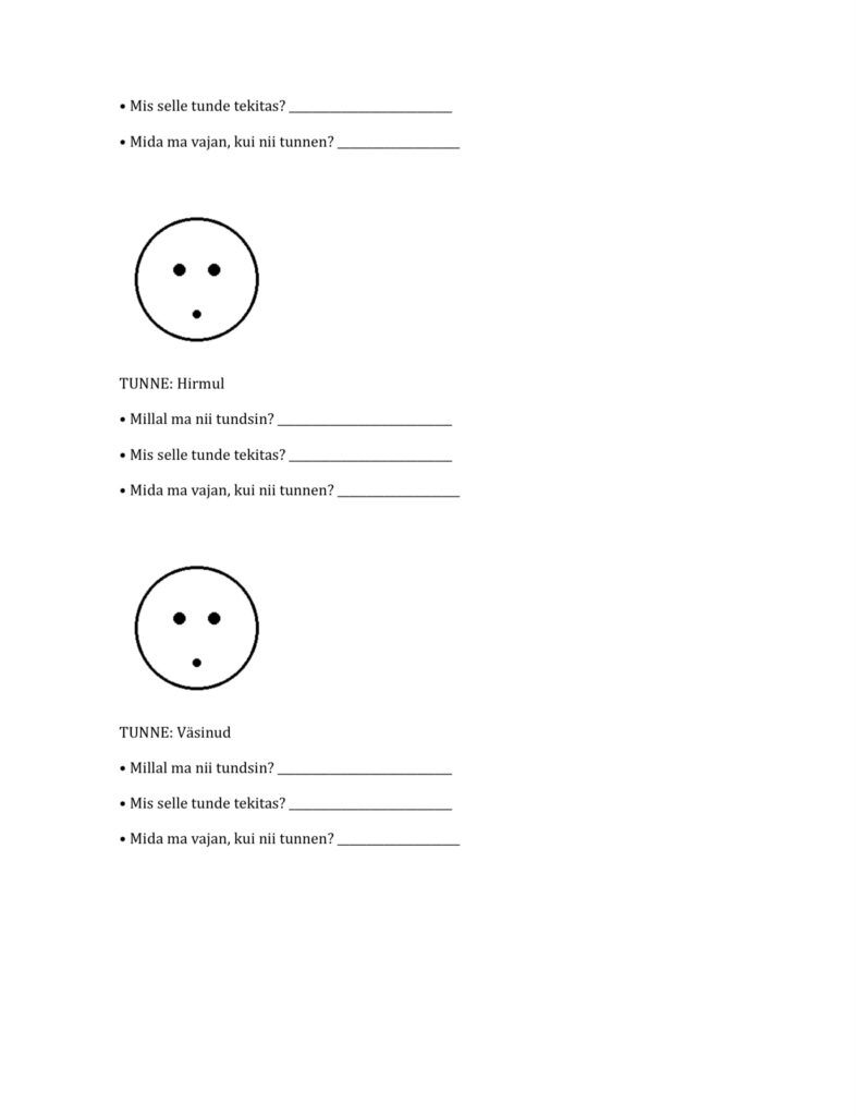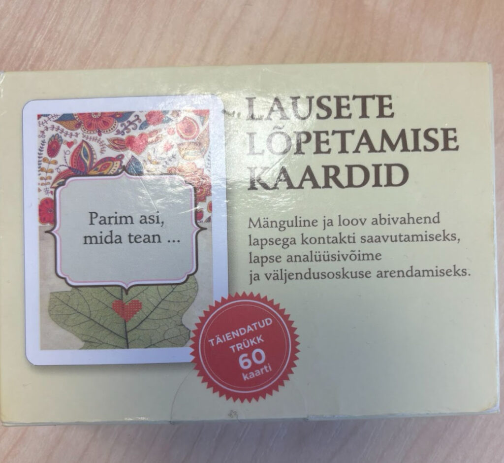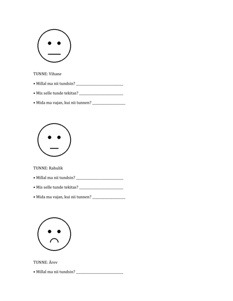 Lisaks kasutan vajadusel erinevaid töölehti ja õppekaarte emotsioonide väljendamiseks olukordades, kus laps ei soovi rääkida, kuid on valmis oma tundeid muul viisil jagama. Olen täheldanud, et töölehtede abil suudab laps oma emotsioone paremini teadvustada ja nimetada. Käeline tegevus aitab sageli pinget maandada ning toetab meeleolu paranemist, kuna laps saab oma sisemisest seisundist selgema arusaama.