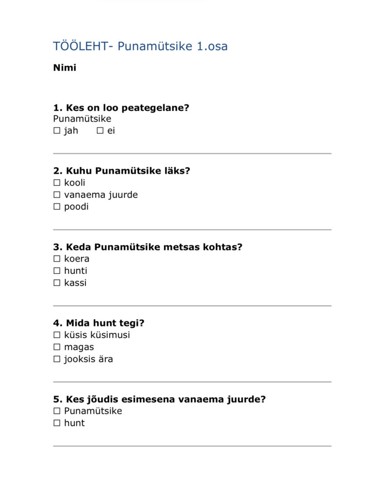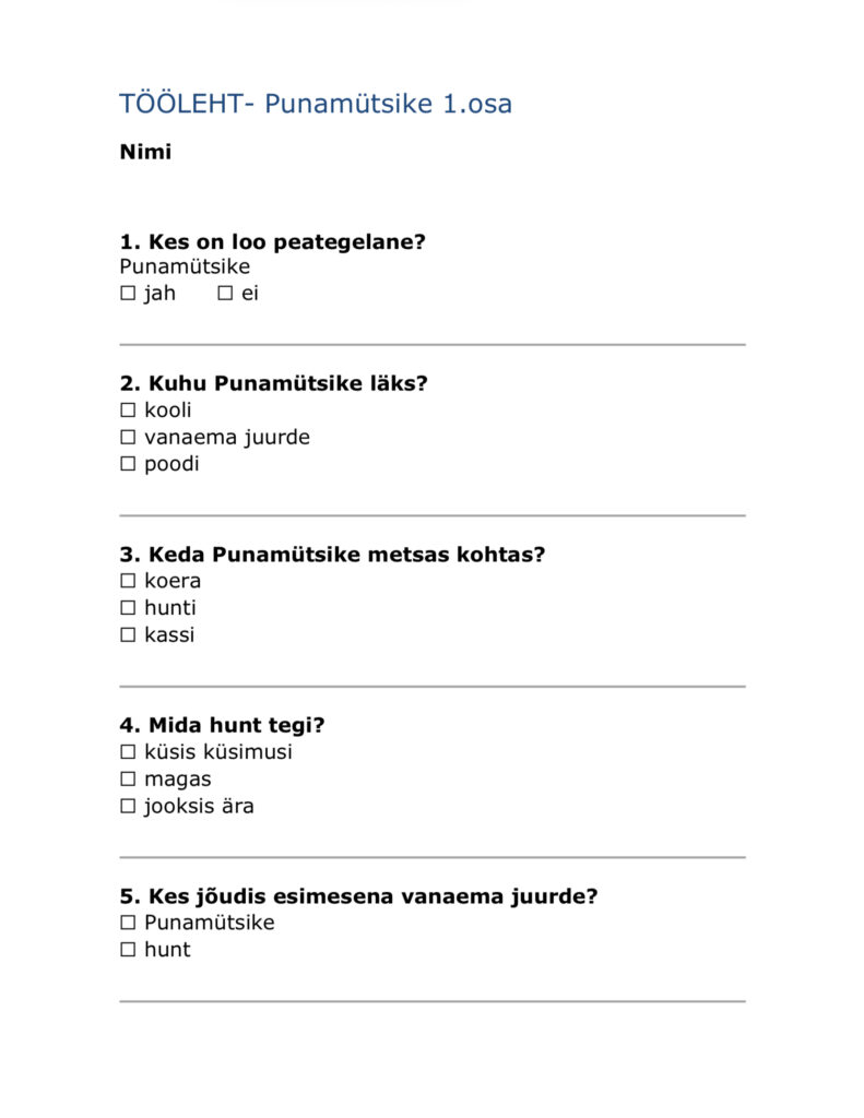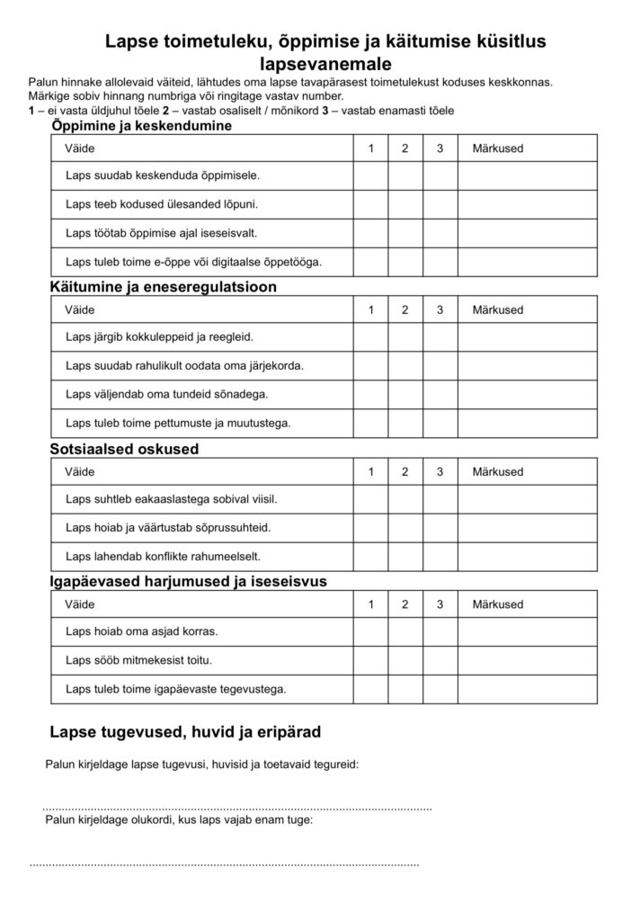 Oma töös kasutan erinevaid küsitluslehti, mida täidavad nii lapsevanemad kui ka õpilased. Tegemist on koolis kasutusel olnud töövahenditega, mida olen kohandanud vastavalt oma klassi ja konkreetsete õppijate vajadustele. Lapsevanematele suunatud küsitlus keskendub lapse igapäevastele harjumustele, tugevustele, arendamist vajavatele külgedele ning õppimist toetavatele tingimustele koduses ja koolikeskkonnas.