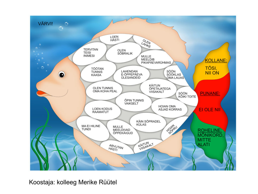 Selle asemel, et sundida õpilast teemaga kohe jätkama, pidasin oluliseks esmalt tema emotsionaalset seisundit toetada. Sõnastasin rahulikult, et mulle tundub, et see teema tekitab temas ebamugavust, ning andsin talle võimaluse oma tundeid väljendada. Rääkisime sellest, mis talle kalade juures ei meeldi ja miks see teema temas pinget tekitab, rõhutasin, et tal on lubatud midagi mitte kohe osata või et mõni teema ei peagi meeldima.