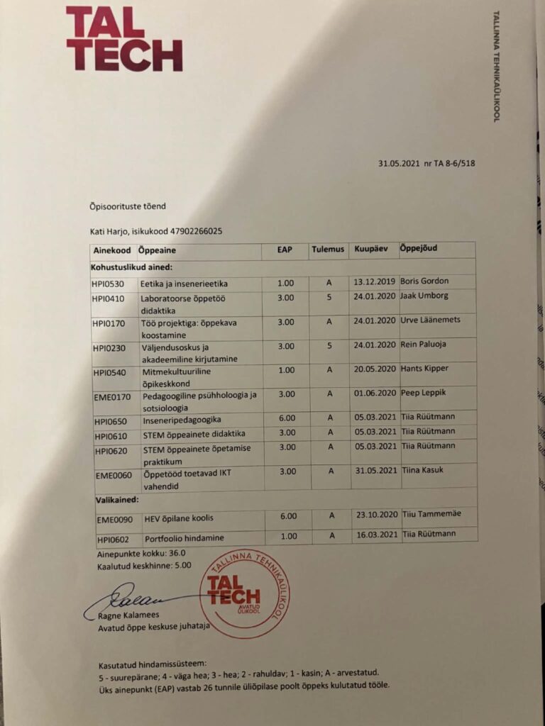 Samuti panustan õpimotivatsiooni toetamisele läbi õppijasõbraliku ja turvalise õpikeskkonna loomise. Suhtun eksimustesse kui loomulikku õppimise ossa ning julgustan õppijaid abi küsima ja oma mõtteid väljendama. Usalduslik õhkkond vähendab ärevust ja toetab aktiivset osalemist õppeprotsessis.