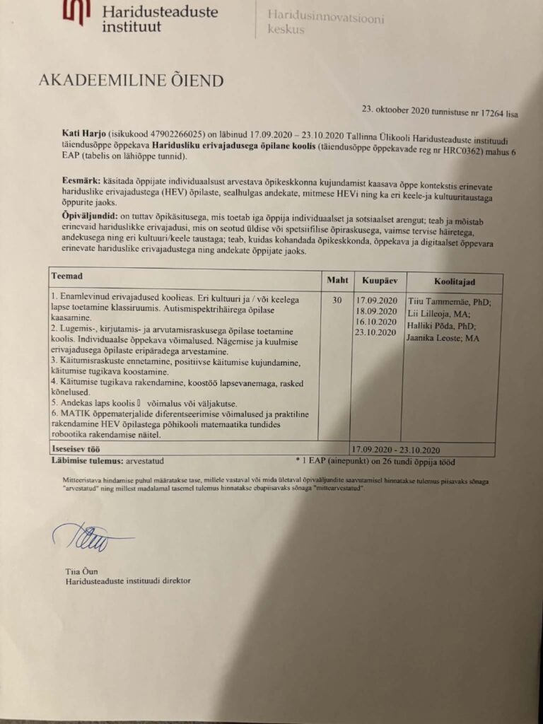 Hetkel töötan individuaalselt ühe õpilasega, mis võimaldab mul keskenduda järjepidevale vaatlemisele, kohandamisele ja toetavate sekkumiste rakendamisele vastavalt konkreetse õppija vajadustele