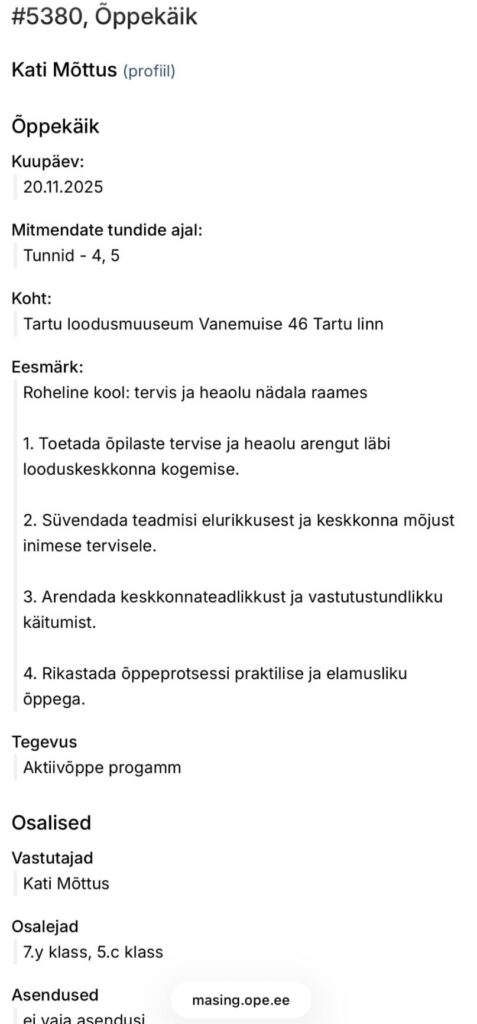 Pärast vestlust pakkusin välja, et läheneme teemale teistmoodi ja väiksemate sammudena. Valisime koos lihtsama ülesande ning keskendusime esmalt üldistele loodusnähtustele, süvenemata talle vastumeelsesse detaili. See aitas pinget vähendada ning võimaldas tal järk-järgult õppetöösse tagasi tulla. Situatsioon kinnitas minu jaoks taas, et õppimine on võimalik alles siis, kui laps tunneb end mõistetuna ja turvaliselt ning et õpetaja roll on paindlikult kohandada õpet vastavalt õppija emotsionaalsele valmisolekule.