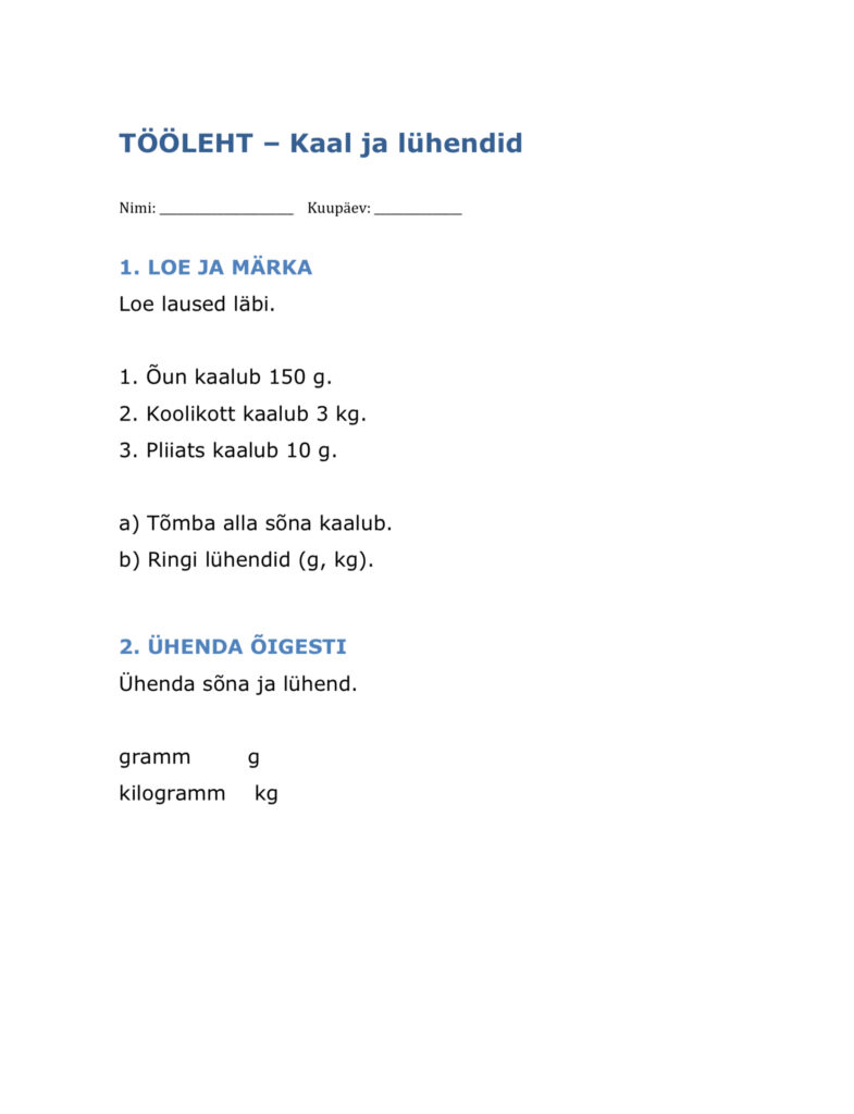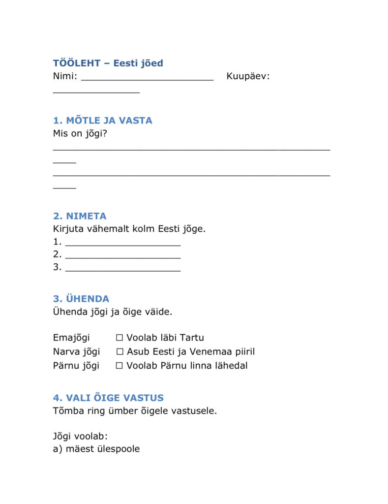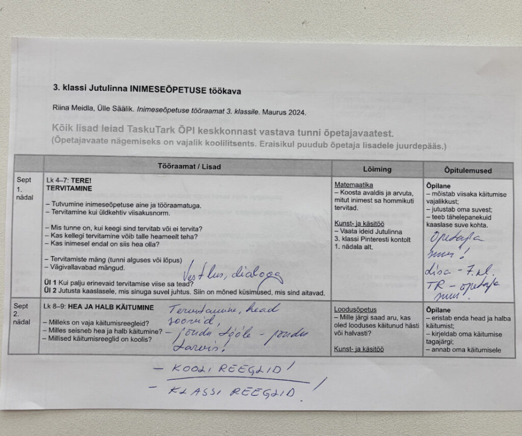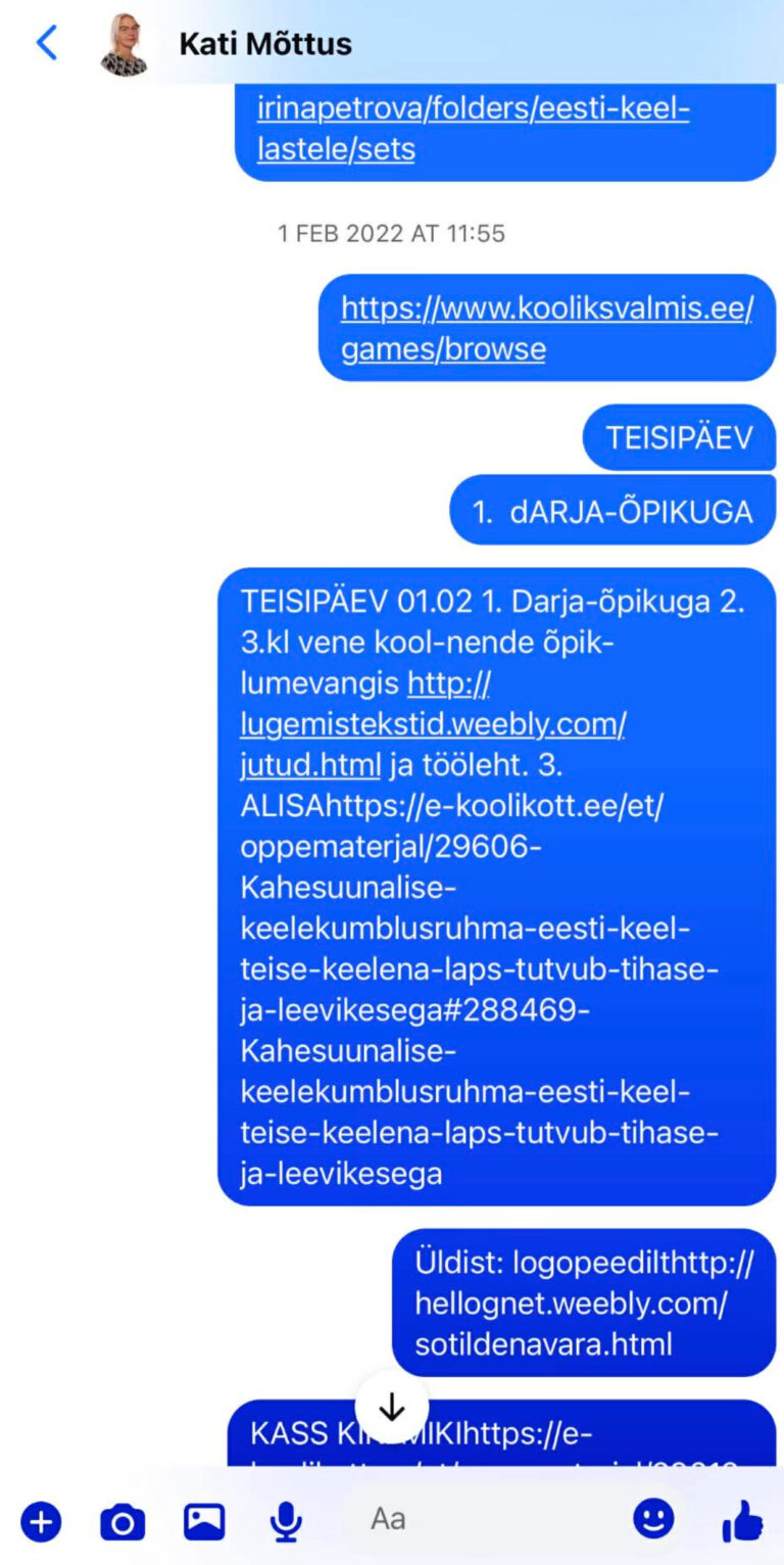 Eesti keele õpetamisel kasutan sageli juba koostatud töölehti ja harjutusi või kasutan kolleegide loodud materjale, kohandades neid vastavalt klassi tasemele ja õppijate keelelisele arengule. Inspiratsiooni ammutan nii kirjastuste Avita, Koolibri, Mauruse ja Studiumi õppematerjalidest kui ka digikeskkondadest nagu Opiq, E-koolikott ja E-kooli ait, samuti kasutan õpetajate kogukondades, näiteks Facebooki gruppides „Eesti keele õpetajad“, „Algklasside õpetajate materjalid“ ja „Õpetajalt õpetajale“, jagatud töölehti, lugemistekste ja keeleharjutusi.